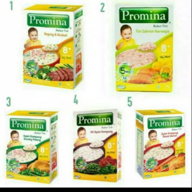 Bubur bayi ini terbuat dari bahan alami terbaik bernutrisi tinggi, serelia, dan susu yang kaya protein. Promina merupakan salah satu merk bubur bayi instan yang sudah terkenal di indonesia. Bubur bayi yang mengandung nutrisi lengkap seperti prebiotik, omega 3 dan 6, kalsium, dan zat besi. Ini sangat membantu untuk menstimulasi pertumbuhan gigi anak. Tak hanya itu, bubur bayi ini juga memiliki rasa yang ringan dan tekstur yang halus sehingga cocok diberikan di masa perkenalan organoleptik/sensori.